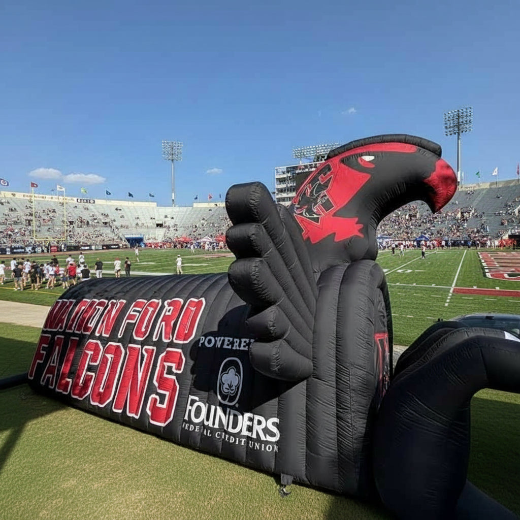 Make a bold entrance and set the stage for excitement with the Inflatable Falcon Tunnel, the perfect centerpiece for sporting events, team entrances, and school spirit displays! This eye-catching inflatable is designed to embody the power and majesty of a falcon, ensuring your team or event soars above the competition.