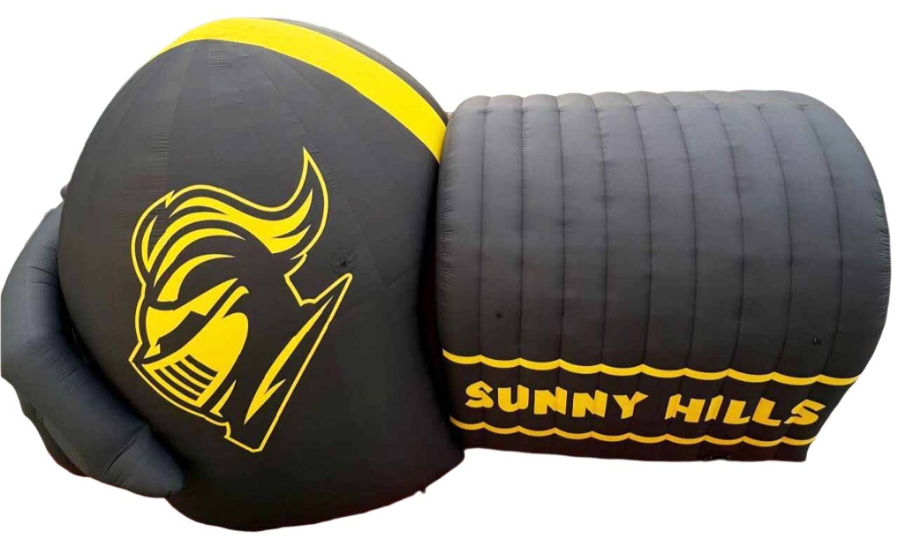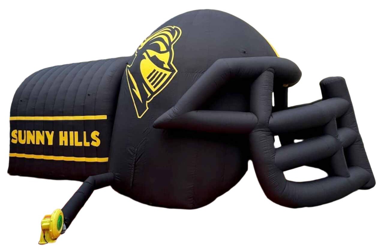 Fully custom made for your team with your logo and colors. Choose to order just an inflatable football helmet, a football tunnel run through, inflatable mascot head, or connect an inflatable football helmet up to a tunnel for an extra long run through.