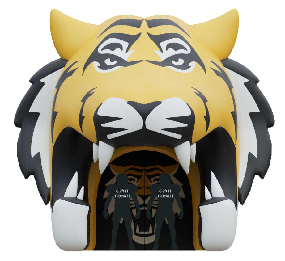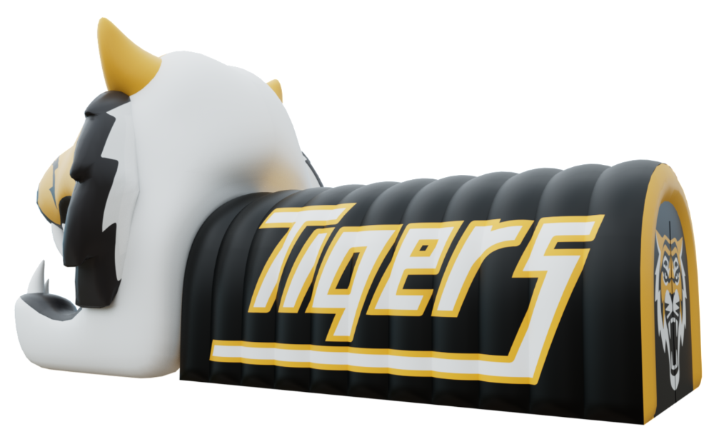 Unleash the roar of your team spirit with this custom Inflatable Tiger Mascot Tunnel — the ultimate entrance for game day! Designed with a fierce tiger head and bold "Tigers" branding down the tunnel, this walk-through inflatable makes a powerful statement before every kickoff.